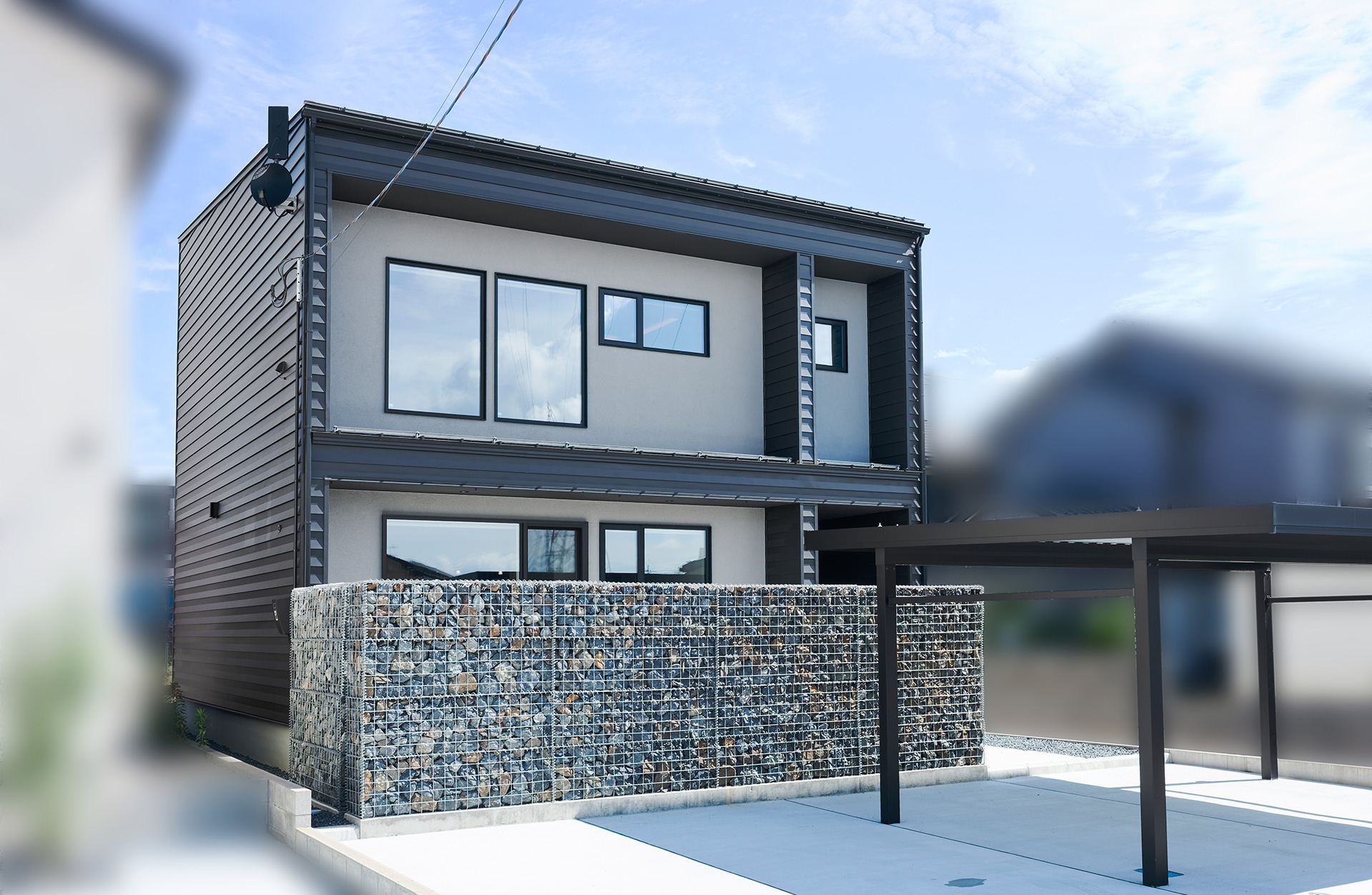 外構には、石を詰めたワイヤーメッシュ構造のガビオンを採用。重厚感のある素材が住まいの外観にアクセントを添えながら、道路からの視線をやわらかく遮る。