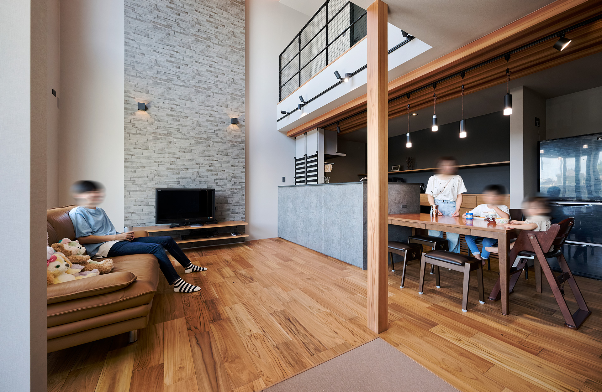 リビングとダイニング、キッチンがゆるやかにつながる一体空間。家族がそれぞれの時間を過ごしながらも、自然と気配を感じられる住まいとなった。