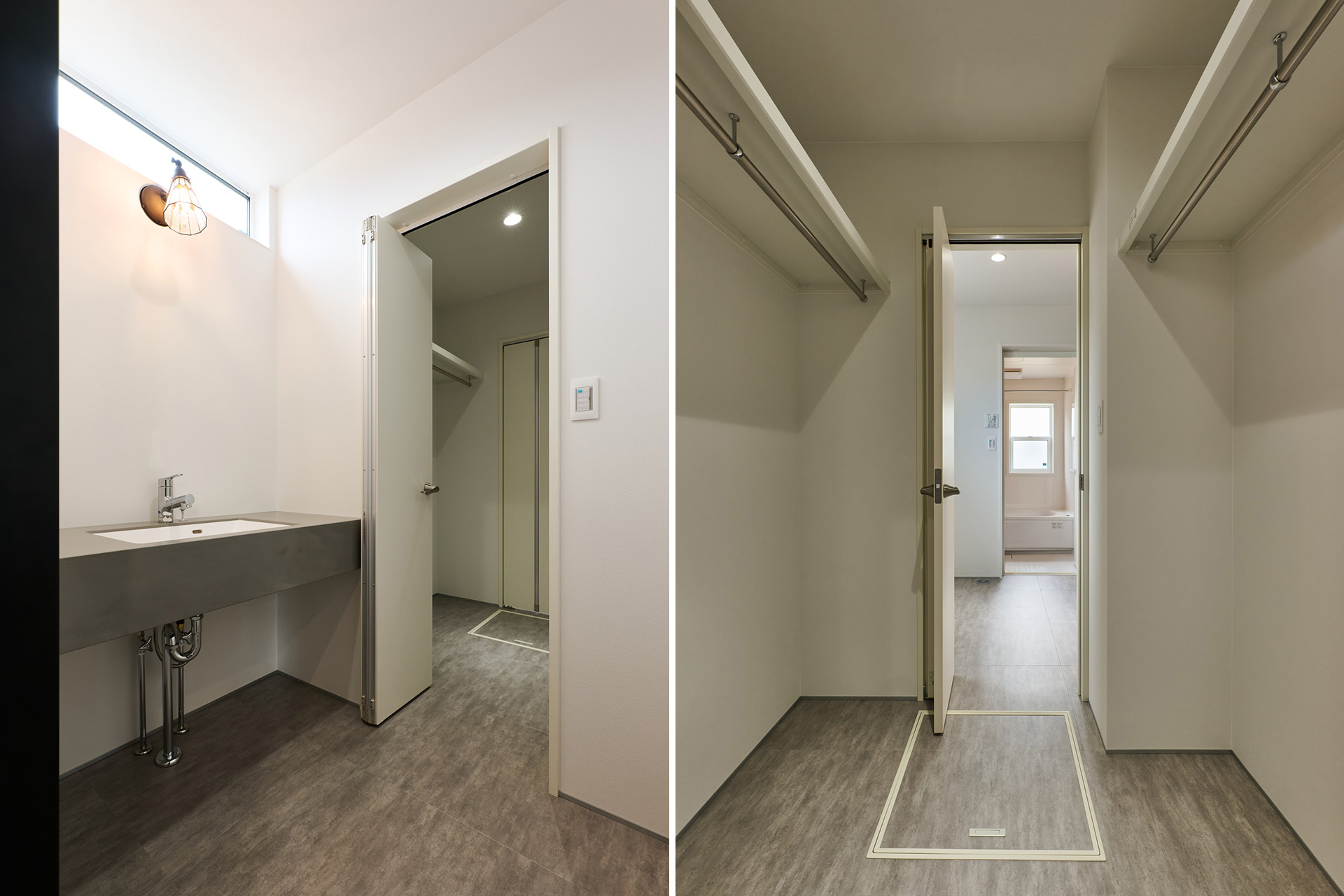 玄関から洗面室、ファミリークローク、脱衣室を通りLDKへとつながる回遊動線。帰宅後の手洗いや着替え、洗濯までを自然な流れで行えるよう計画している。