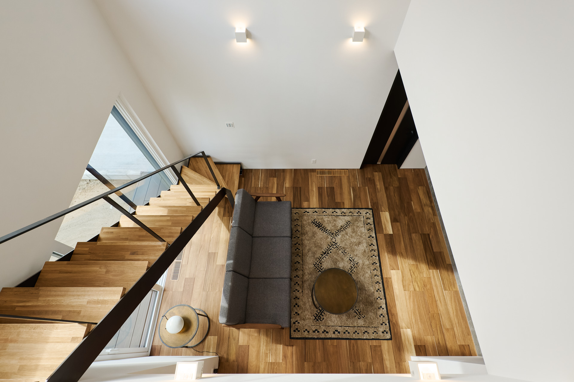 吹き抜けと鉄骨階段が目を引くリビング空間。南向きの窓から取り込んだ光が、室内にのびやかな広がりをもたらす。